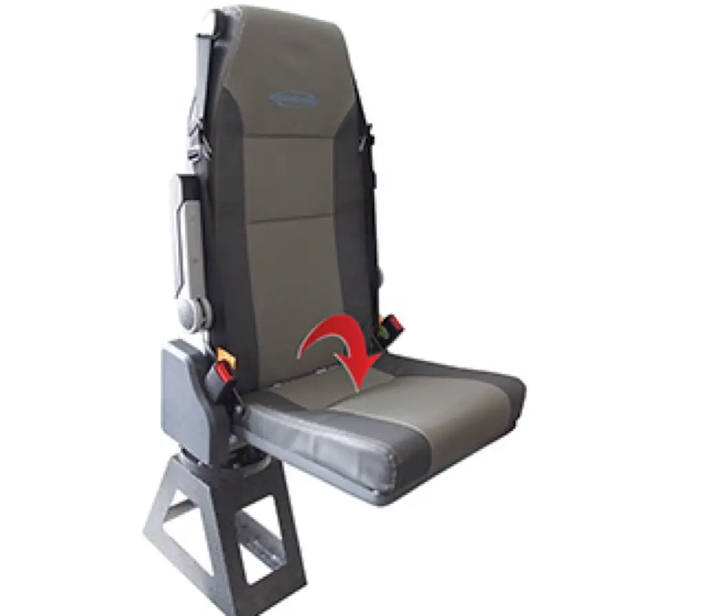El asiento de azafata cuenta con doble sistema de cinturón de seguridad, respaldo y descansa brazos plegables, reposacabezas integrado y cuenta con una base que permite un movimiento rotativo de 360°.
