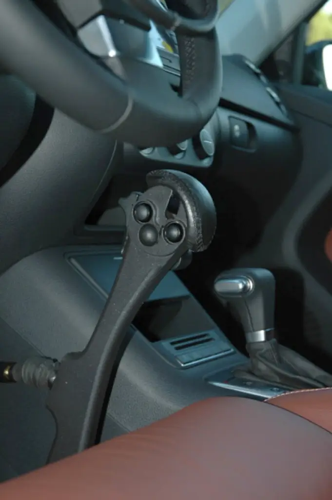 La palanca del freno D907P con mango recubierto en piel, su soporte se fija a los puntos de anclaje originales del asiento del conductor. Esto hace que se elimine cualquier estorbo bajo el volante, permitiendo además mantener si ha sido previsto por el modelo del vehículo la regulación del volante en altura y profundidad. La palanca del freno se acciona a través de un empuje manual hacia adelante y está equipada por dos botones para la bocina y para bloqueo, con que facilita los arranques en cuestas arriba.